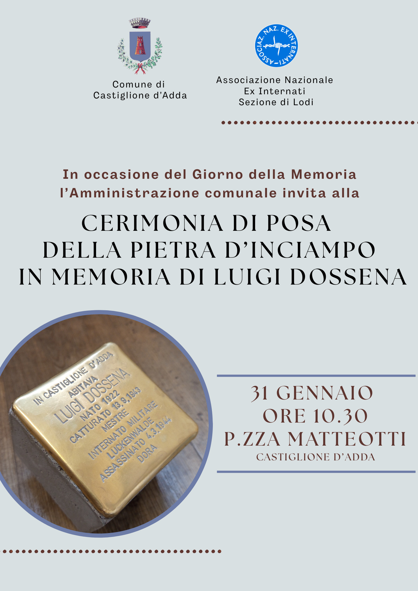 In occasione del Giorno della Memoria, l'Amministrazione Comunale unitamente all'ANEI Associazione Nazionale Ex internati - Sezione di Lodi invita la cittadinanza alla cerimonia di posa della pietra d'inciampo in memoria del Concittadino Luigi Dossena, internato nel campo di Dora nell’autunno del 1943, dove morì il 04/03/1944, e insignito della medaglia d’onore.