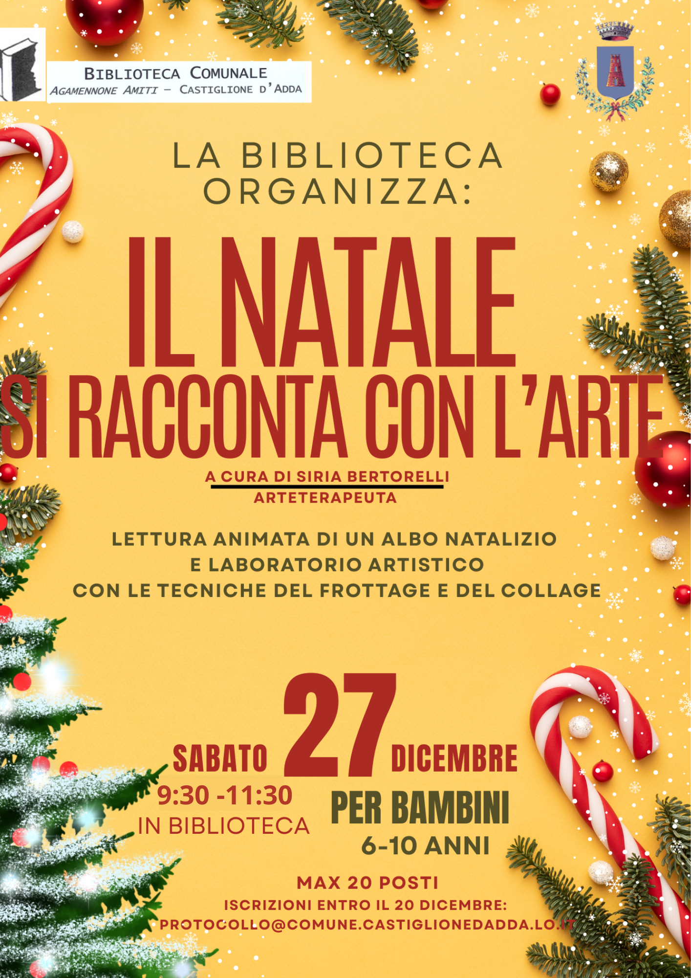 La Biblioteca comunale organizza: "Il Natale si racconta con l'Arte": lettura animata di un albo natalizio e laboratorio artistico con le tecniche del frottage e del collage. Per bambini della Scuola Primaria.